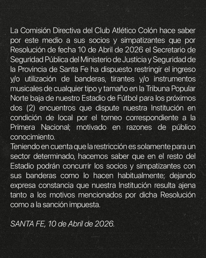La dirigencia de Colón comunicó ayer que las medidas impuestas por el Ministerio de Seguridad de la provincia Santa Fe estaràn vigentes este domingo en el cotejo del Sabalero ante Racing de Còrdoba.