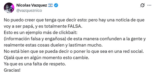 “Esto es un ejemplo más de clickbait: (información falsa y engañosa) de esta manera confunden a la gente y realmente estas cosas duelen y lastiman mucho. No está bien que se pueda decir o poner lo que sea en una red social. Ojalá que en algún momento esto cambie. Ya que es una falta de respeto. Gracias!”, concluyó.