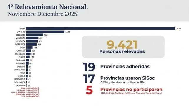 El estudio se llevó adelante a través del sistema DataCalle, integrado al SiSoc (Sistema Social), lo que permitió relevar tanto a personas que viven en la vía pública como a quienes se encuentran en refugios y centros de alojamiento transitorio. En total participaron 19 provincias.
