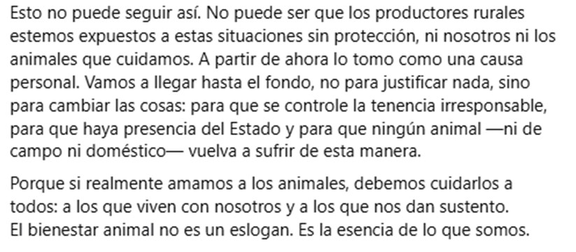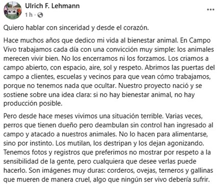"Hace meses vivimos una situación terrible. Varias veces, perros que tienen dueño pero deambulan sin control han ingresado al campo y atacado a nuestros animales. No lo hacen para alimentarse, sino por instinto. Los mutilan, los destripan y los dejan agonizando. Tenemos fotos y registros que preferimos no mostrar por respeto a la sensibilidad de la gente, pero cualquiera que desee verlas puede hacerlo. Son imágenes muy duras: corderos, ovejas, terneros y gallinas que mueren de manera cruel, algo que ningún ser vivo debería sufrir" dio en su escrito.