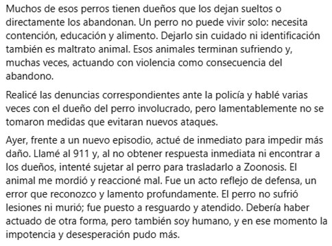 "Ayer, frente a un nuevo episodio, actué de inmediato para impedir más daño. Llamé al 911 y, al no obtener respuesta inmediata ni encontrar a los dueños, intenté sujetar al perro para trasladarlo a Zoonosis. El animal me mordió y reaccioné mal. Fue un acto reflejo de defensa, un error que reconozco y lamento profundamente. El perro no sufrió lesiones ni murió; fue puesto a resguardo y atendido. Debería haber actuado de otra forma, pero también soy humano, y en ese momento la impotencia y desesperación pudo más" se justificó.