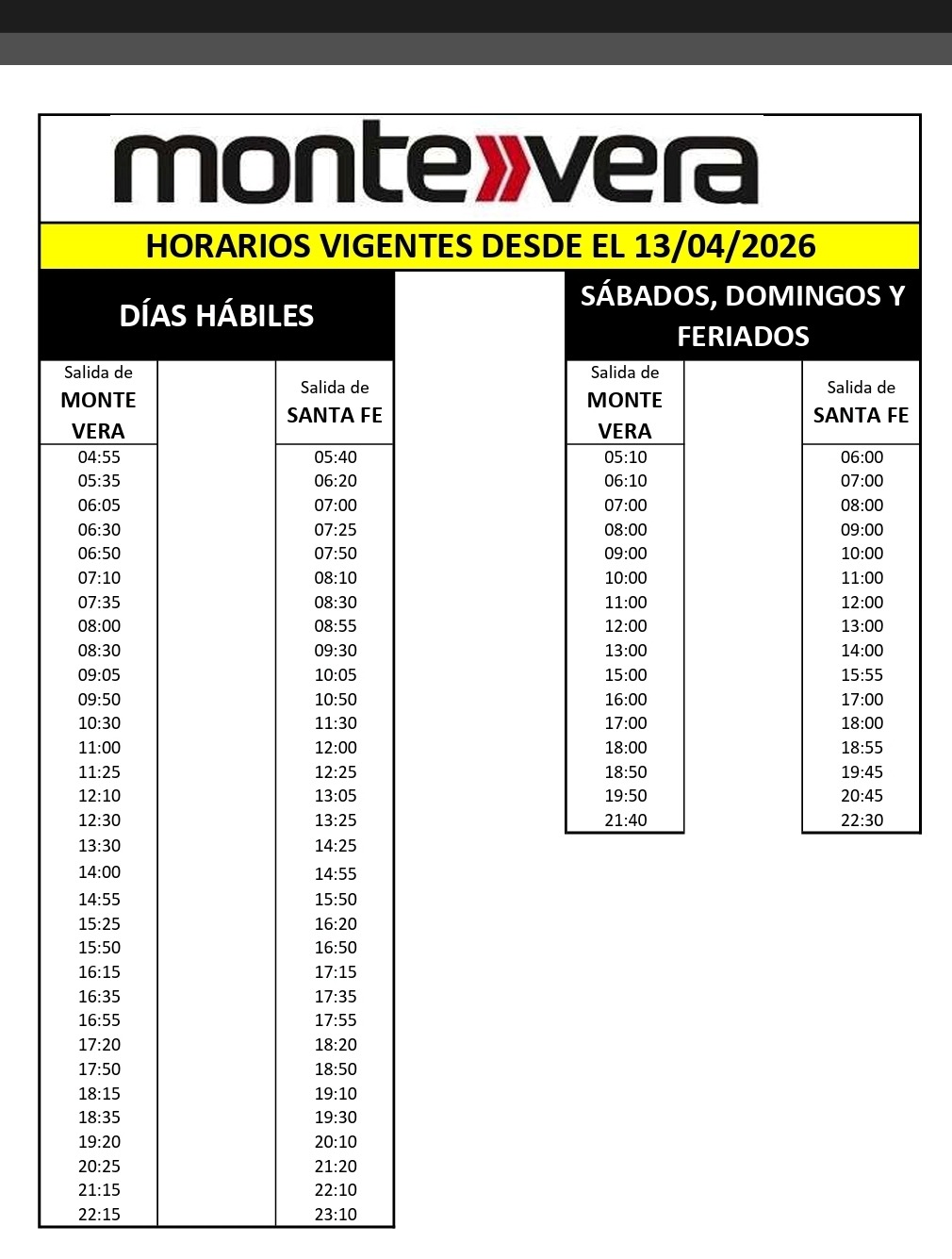 La empresa interurbana de colectivos Monte Vera, que presta servicio entre dicha localidad y la ciudad de Santa Fe, anunció cambios en la frecuencia de sus líneas debido a la compleja situación económica que atraviesa el sector.