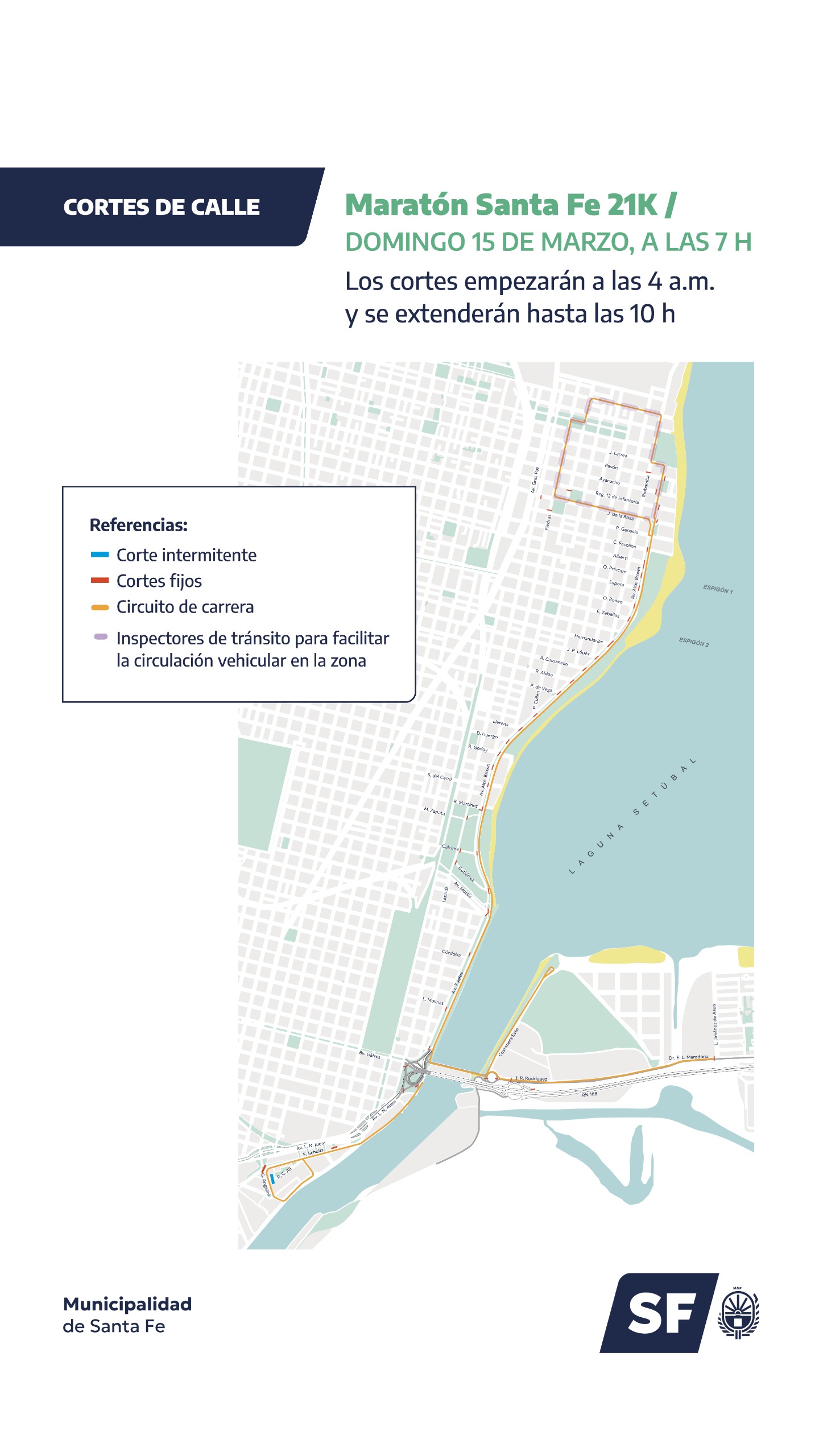 La largada de las pruebas de 21 y 10 kilómetros será a las 7 de la mañana, mientras que la carrera de 5 km comenzará a las 7.15. Por el desarrollo de la competencia se registrarán cortes y restricciones de tránsito en sectores de las costaneras, el Puente Colgante y calles cercanas al circuito.