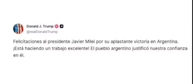 “Felicitaciones al presidente Javier Milei por su aplastante victoria en Argentina. ¡Está haciendo un trabajo excelente! El pueblo argentino justificó nuestra confianza en él”, escribió el mandatario estadounidense a través de su cuenta de Truth.