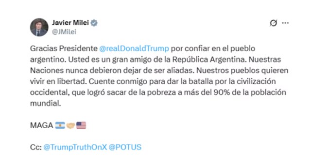 Por su parte, el libertario contestó: “Gracias Presidente Donald Trump por confiar en el pueblo argentino. Usted es un gran amigo de la República Argentina. Nuestras Naciones nunca debieron dejar de ser aliadas. Nuestros pueblos quieren vivir en libertad. Cuente conmigo para dar la batalla por la civilización occidental, que logró sacar de la pobreza a más del 90% de la población mundial”.