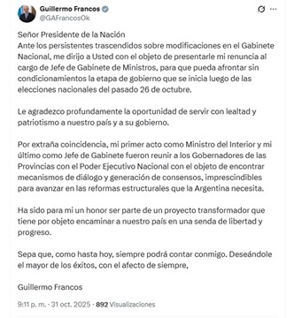 La dimisión de Francos, que se produce tras las elecciones legislativas del 26 de octubre, era un hecho inminente según habían informado fuentes cercanas al Gobierno a Noticias Argentinas.