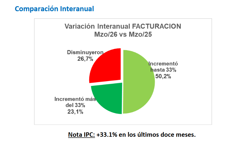El mismo indica que un 23.1% de los comercios relevados informó un crecimiento superior al IPC anual, un 50.2% informó crecimiento en la facturación por debajo del índice IPC, es decir, disminuyeron su actividad en términos reales, y un 26.7% reportó directamente menor facturación en términos nominales.