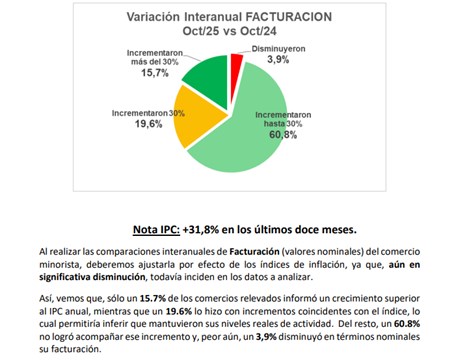 Sólo el 15,7% de los comercios consultados registró un crecimiento en su facturación por encima del Índice de Precios al Consumidor (IPC), que aumentó 31,8% en los últimos doce meses. Otro 19,6% logró igualar ese nivel de incremento, lo que les permitió mantener su nivel real de ventas. Sin embargo, el 60,8% de los locales no logró acompañar la inflación, mientras que un 3,9% reportó incluso una caída nominal en la facturación.
