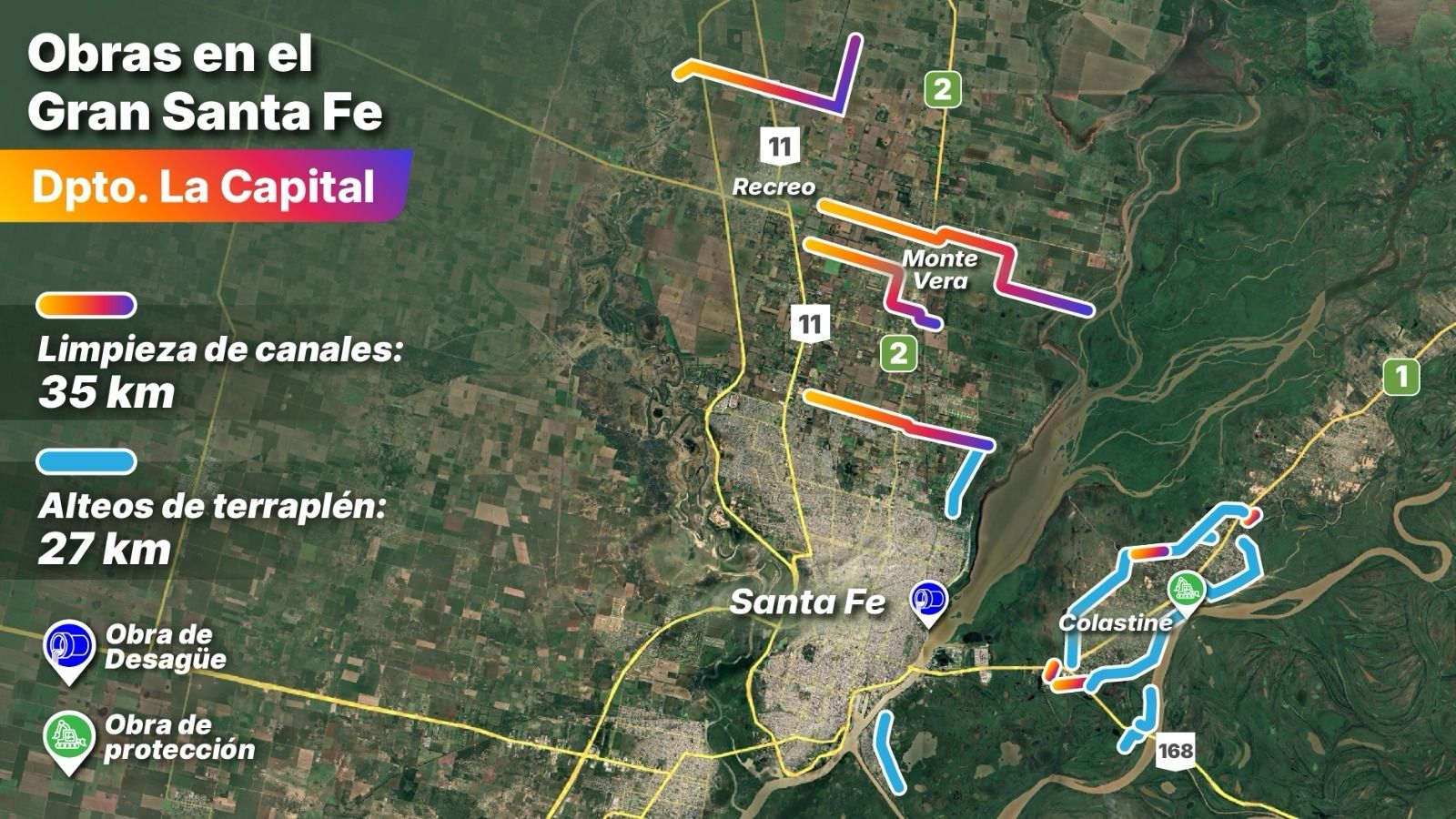Desde el Ministerio de Obras Públicas señalaron que, entre las tareas de mantenimiento y reparación del sistema de defensas de Gran Santa Fe, se destacan la limpieza de aproximadamente 35 kilómetros de canales, el alteo de terraplén a lo largo de 27 kilómetros y la limpieza de 34 kilómetros de taludes.