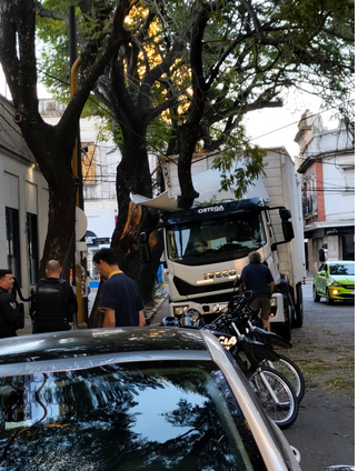 En la intersección de las calles 25 de Mayo y Mendoza, un camión se llevó puesto una importante rama de un árbol.